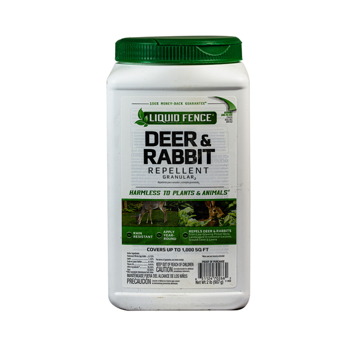 Protects landscapes and gardens like a fence! Stops rabbits and deer from eating garden and landscape plants. Works on scent, so animals don't even have to take a bite to be repelled. Easy to use, rain-resistant, environmentally safe, biodegradable and will not harm plants or animals. Available as liquid concentrate or time-released granules. 2 lb size - covers 1000 sq ft.; 5 lb size - covers 2500 sq ft.